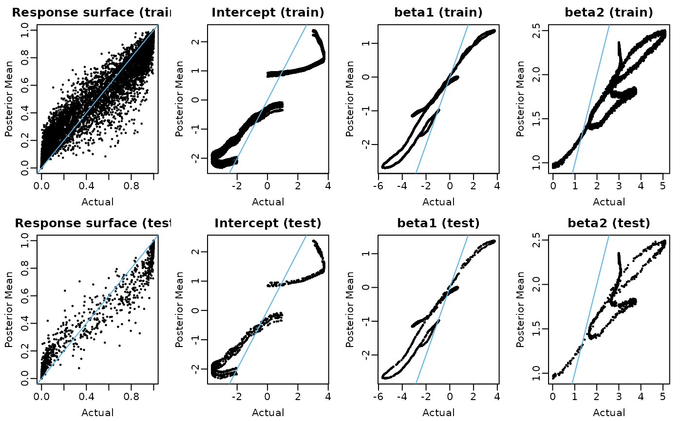 xlab = "Actual", ylab = "Posterior Mean", main = "Response surface (test)")