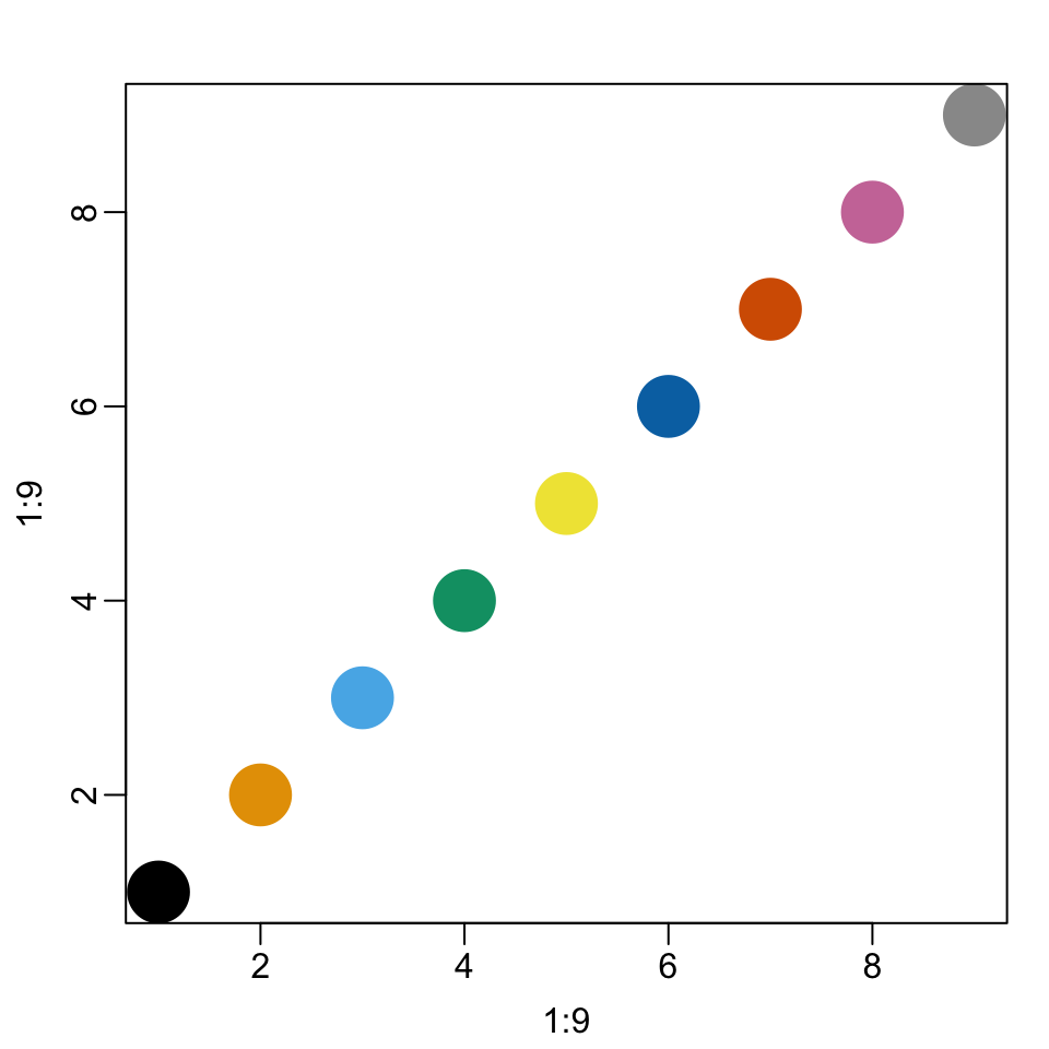 plot(1:9, 1:9, pch = 16, cex = 4, col = oi_colors)- 1