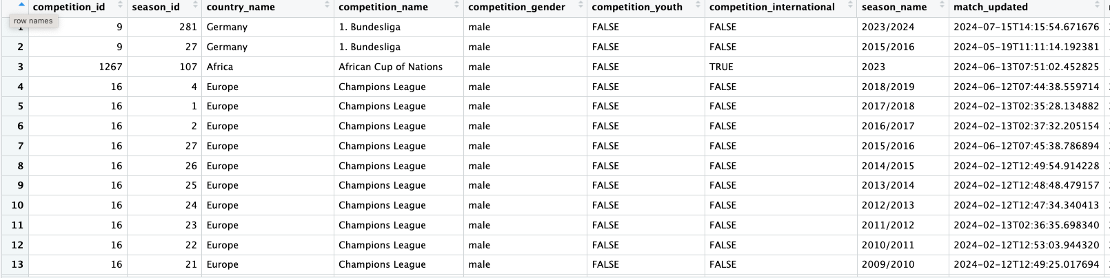 Each competition and season have unique id and we can also see whether it was a men’s or women’s competition. To see which matches from selected competitions have publicly available data, we can pass the corresponding rows of this table to the function StatsBombR::FreeMatches(). For instance, here are the first few rows and some selected columns from the matches from EURO 2022. StatsBomb graciously provided data for all the matches in the tournament. Here is a table of matches from the 2022 EURO Competition; StatsBomb graciously provided data for all matches from the tournament, which can be obtained using the code below.