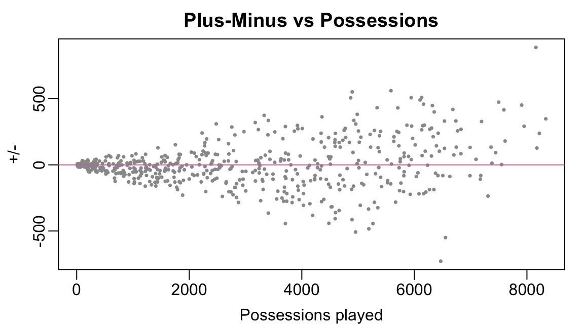 In today’s lecture, we introduce two now-classical approaches to player evaluation: plus/minus (Section 3) and adjusted plus/minus (Section 4). At a high-level, plus/minus is simply the total point differential that a player’s team accrues when he is on the court. Adjusted plus/minus measures how much more a player contributes to his team’s point differential per 100 after accounting than a baseline-level player, after accounting for the relative contributions of his teammates and opponents.