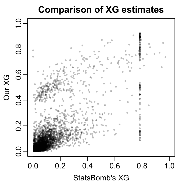\[ \beta_{0} + \beta_{1}\times \textrm{DistToGoal} + \\ \beta_{\textrm{LeftFoot}}\times \mathbb{I}(\textrm{LeftFoot}) + \beta_{\textrm{RightFoot}} \times \mathbb{I}(\textrm{RightFoot}) \]